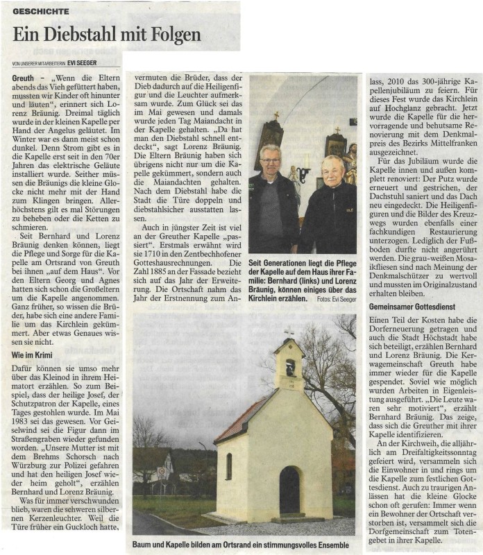 1983 wurde die Figur des heiligen Joseph aus der Kapelle gestohlen und bei Geiselwind im Straßengraben wiedergefunden.